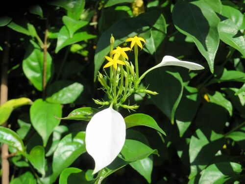<コンロンカ(崑崙花)> 歩道の植え込みスペースに植わっていて、一瞬「半夏生に花が!?」と勘違いしそうになったけど、全然ちがいます。アフリカ原産の低木で、白いのは萼片。種類によっては萼片がピンクや赤のもあるそうです。 たぶんムラサキシキブで…